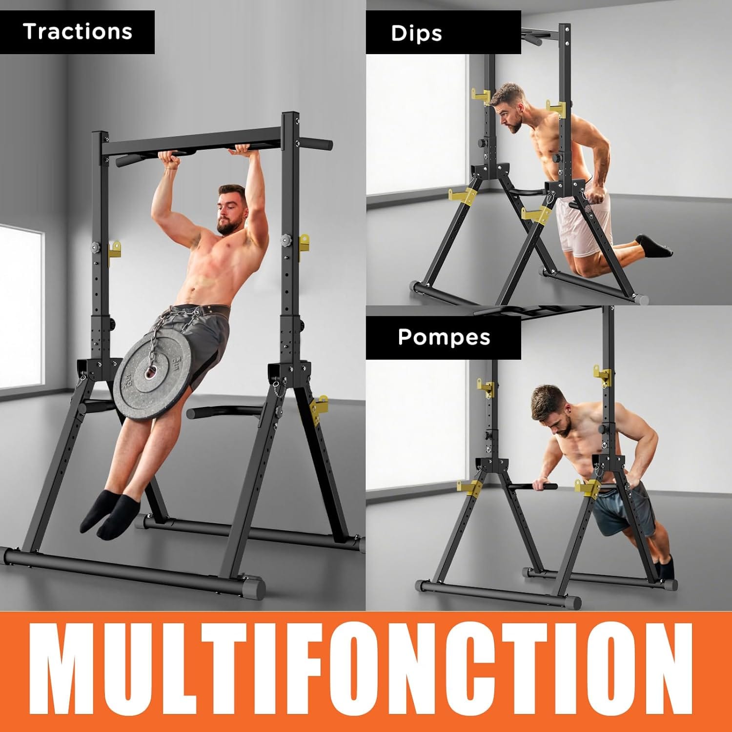 【APPAREIL D'ENTRAÎNEMENT TOUT-EN-UN MULTIFONCTIONNEL】 Idéal pour les tractions, les pompes, les dips ainsi que les exercices pour les bras, le dos, les abdos et les jambes. Deux supports supplémentaires pour haltères permettent des exercices avec barre tels que le soulevé de terre, les squats ou le clean and press – pour une variété maximale d’entraînements.