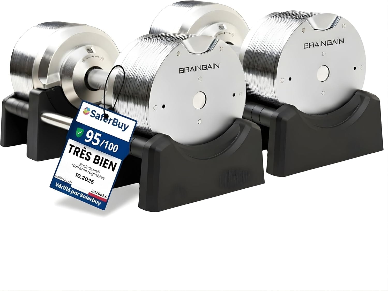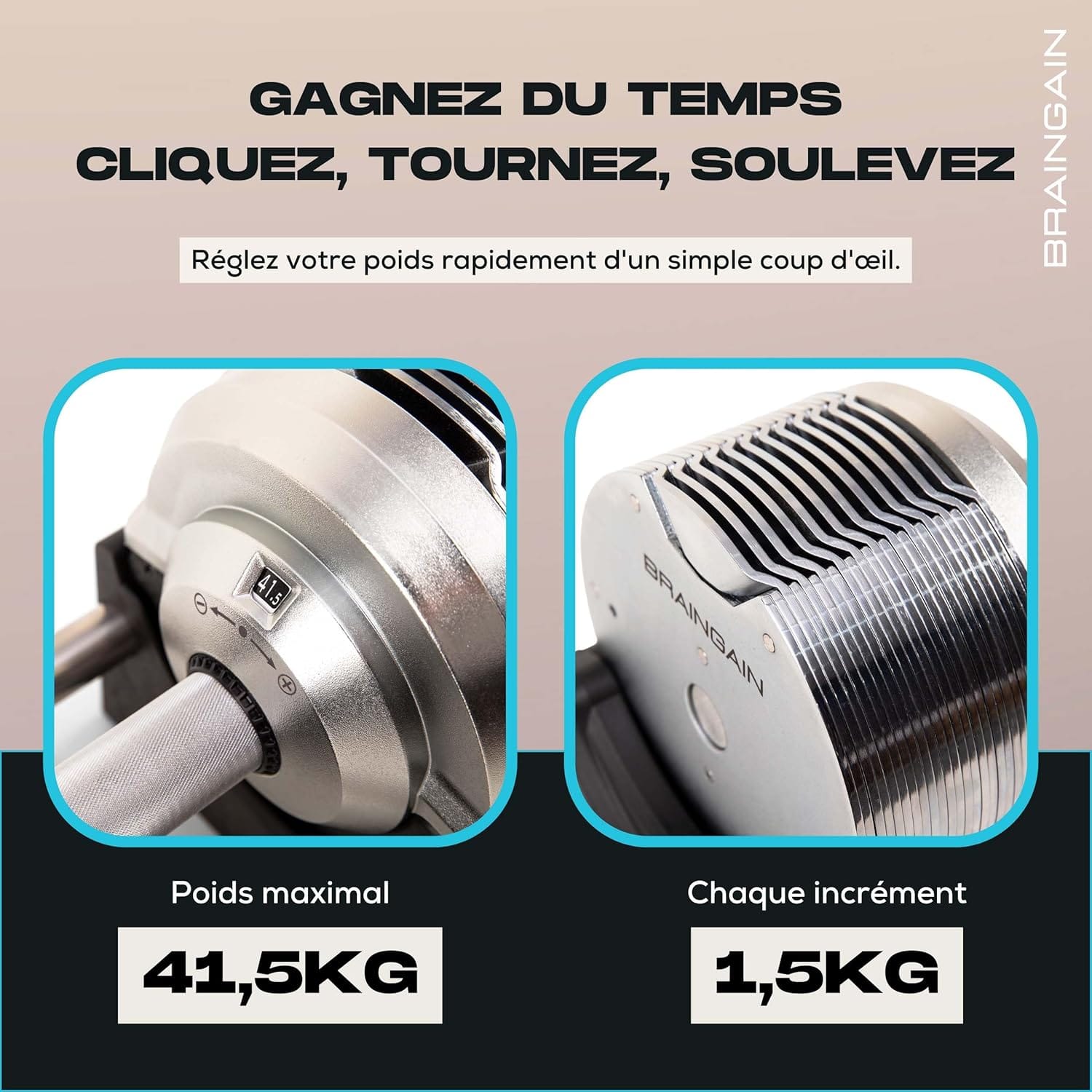 COMPACT, MAIS PUISSANT – Remplacez plusieurs haltères individuels par un seul ensemble d'haltères réglables. Choisissez parmi 14 réglages sur la version 23,5 kg (4 kg à 23,5 kg), 20 réglages sur la version 32,5 kg (4 kg à 32,5 kg) ou 26 réglages sur la version 41,5 kg (4 kg à 41,5 kg), tous par incréments de 1,5 kg.