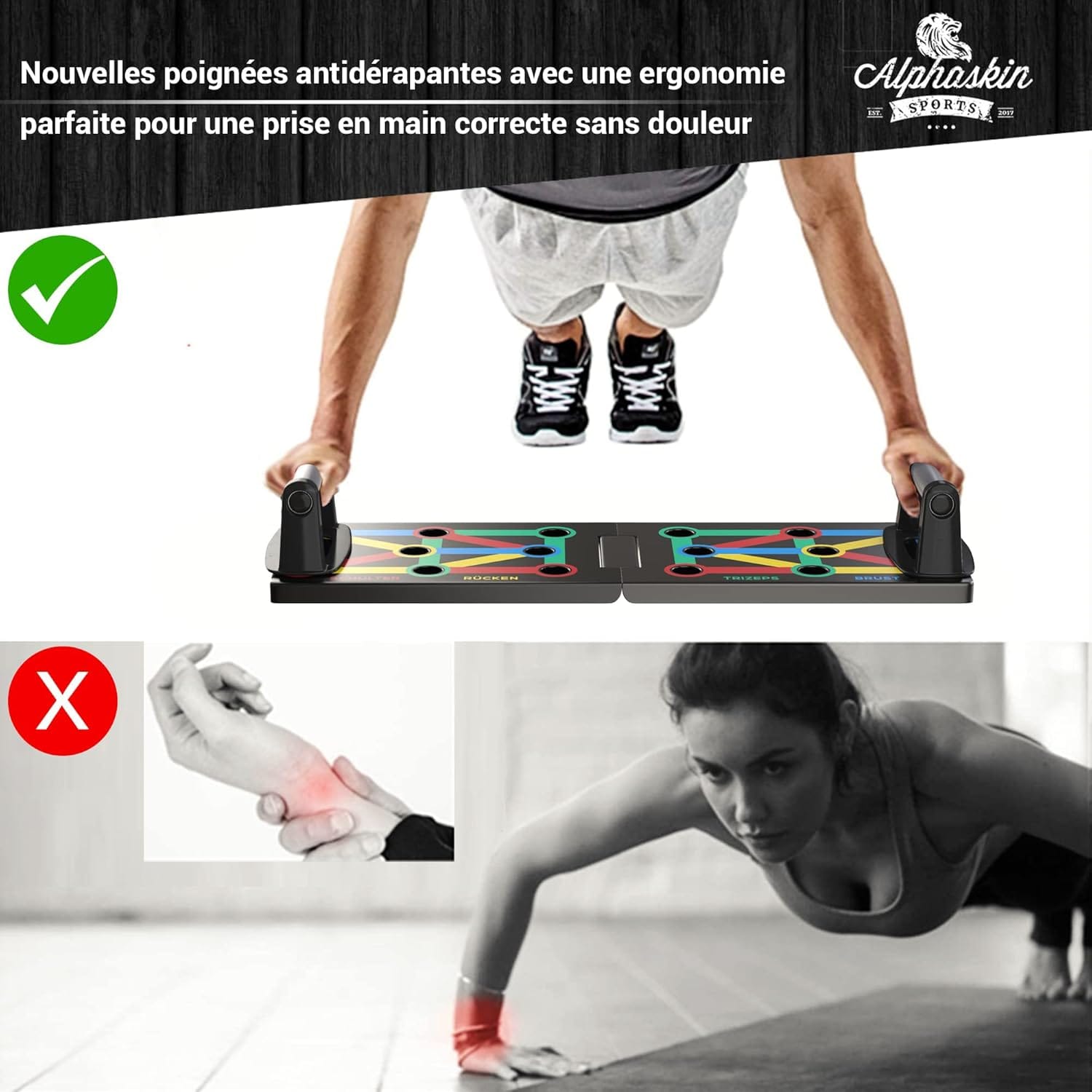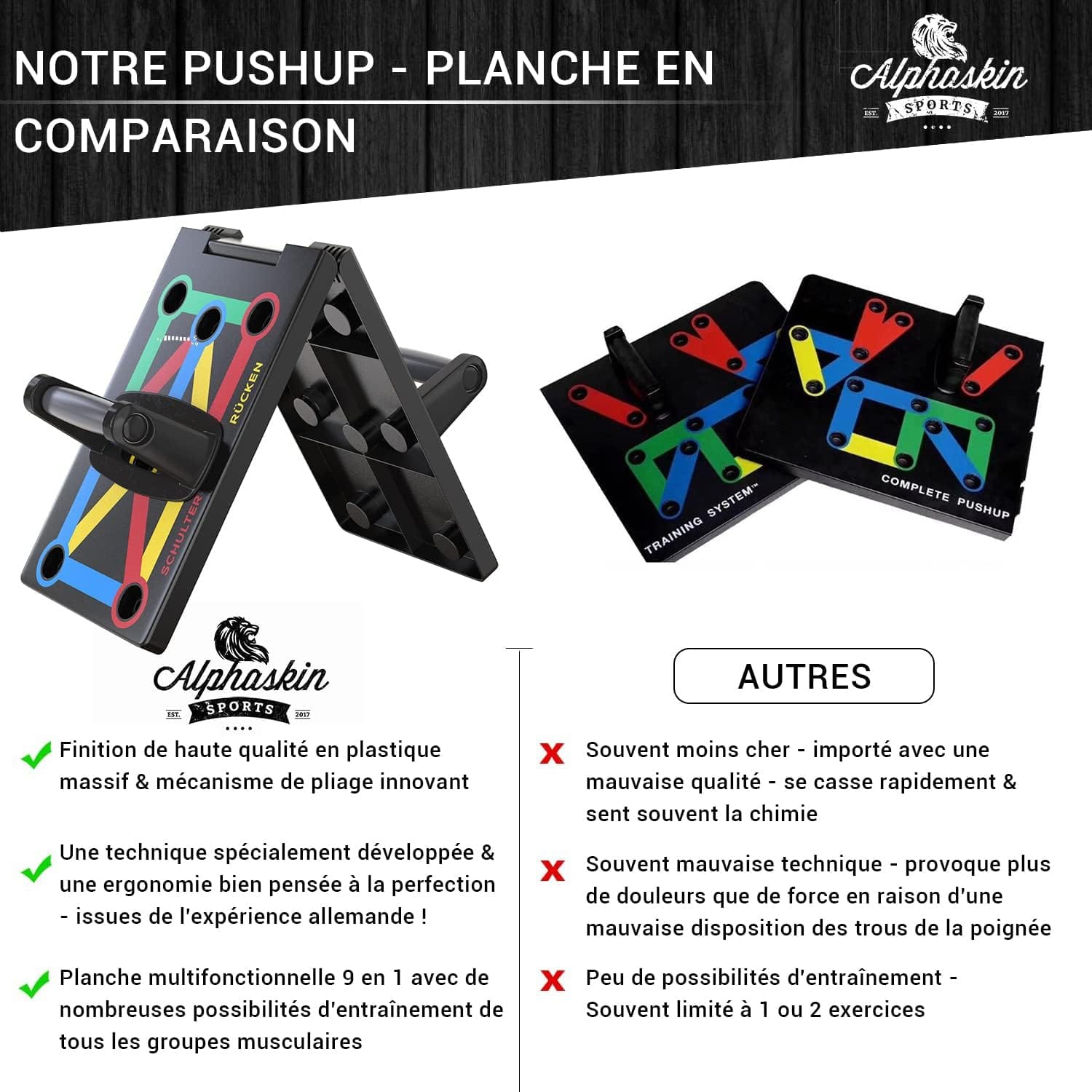 LA BARRE D'ENTRAÎNEMENT ULTIMATIVE - Pour un entraînement efficace du haut du corps avec plus de 9 possibilités d'entraînement différentes, qui a été spécialement développée selon les normes de qualité allemandes éprouvées ALPHASKIN, afin d'entraîner chaque muscle de manière optimale. Que ce soit pour la musculation, le fitness, l'endurance ou la rééducation après une blessure : Le Push Up Board 2.0 est idéal pour entraîner de manière ciblée chaque groupe de muscles