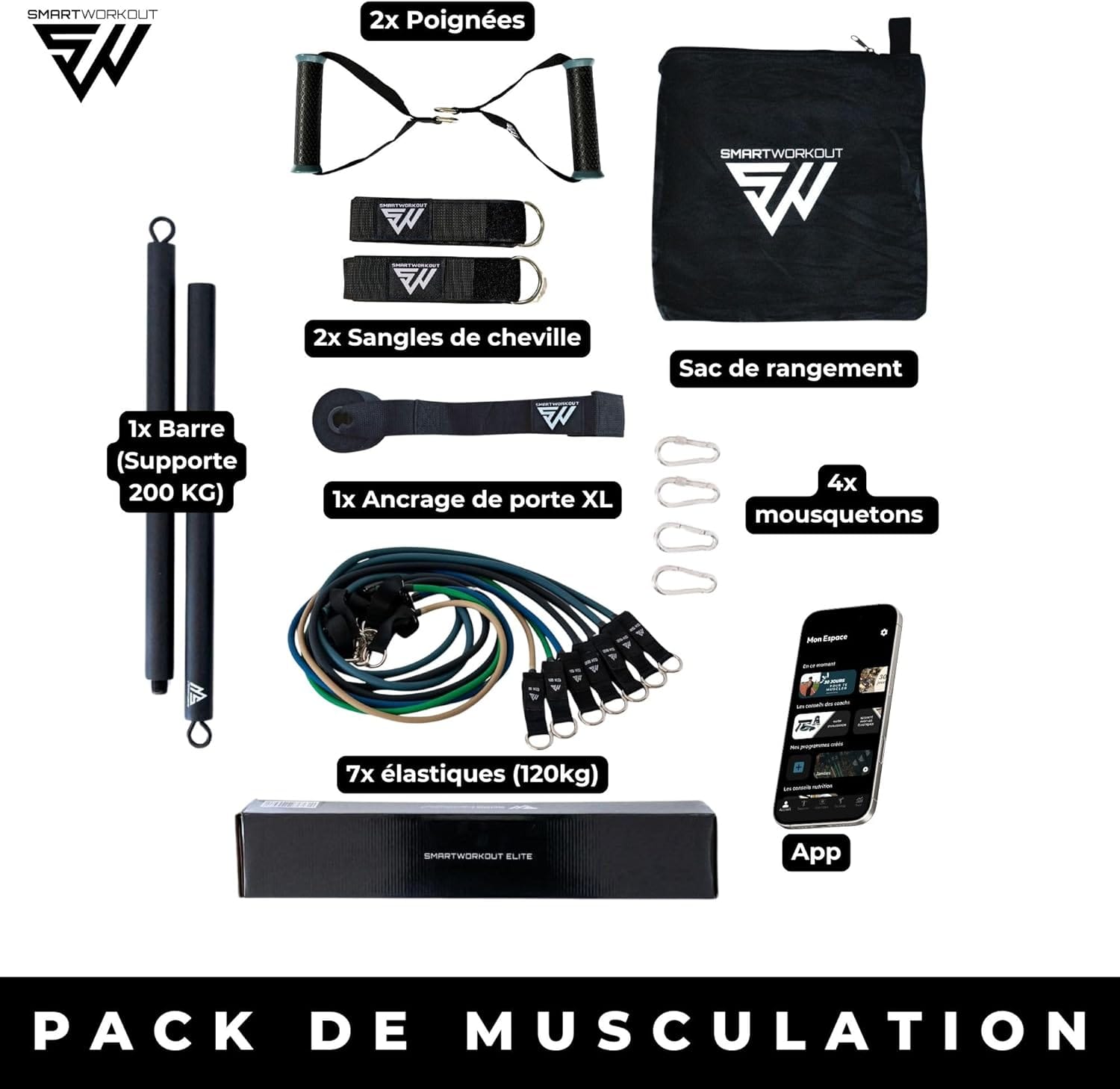 KIT D’ÉLASTIQUES DE MUSCULATION COMPLET (AVEC BARRE ET PROGRAMME) : SmartWorkout Élite est un équipement de musculation révolutionnaire, qui permet de se muscler rapidement et de travailler tous les groupes musculaires grâce à la barre SmartWorkout et les programmes de musculation pour élastiques.